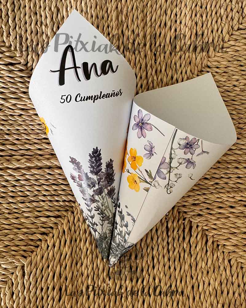Los conos para pétalos son conos grandes de aproximadamente unos 20 cm. y van impresos en papel de 300 gramos a una sola cara. Los enviamos completamente montados, listos para colocar donde queráis ponerlos. Los conos son ideales para llenar de pétalos para tirar en la ceremonia, pero también podéis llenarlos de confeti, arroz o para pueden valer para vuestra mesa dulce.