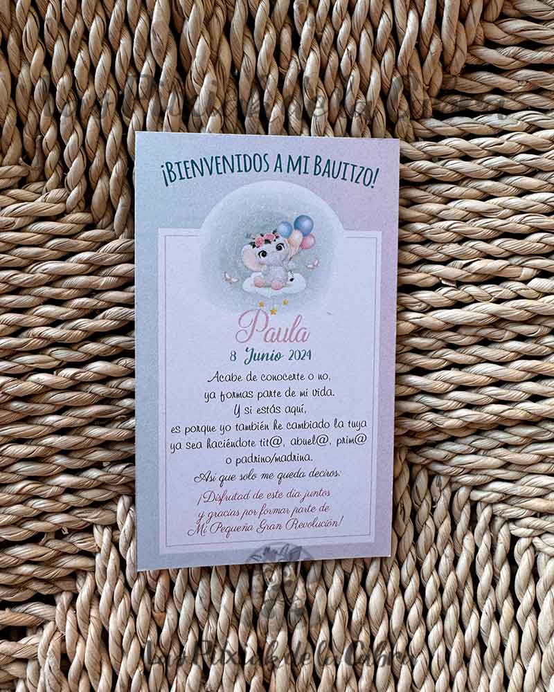 ¿Sabías que…? Este modelo de Tarjeta de Agradecimiento Bautizo Paula se llama como la primera bebé para el que diseñamos toda la papelería para su bautizo y quedo todo precioso, es decir aunque en la web hay poca variedad, podemos diseñar cada cosita desde cero para vosotros con todas las ideas que tengáis. Muchas gracias